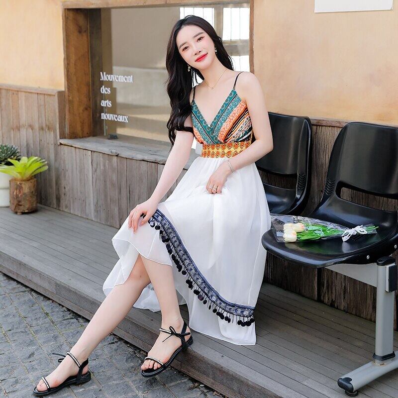 夏のボヘミアンセクシーな V ネックビーチドレス女性フェイクツーピースステッチウエストペンダントホワイトミディパーティードレスサンドレス サマー 夏物 Vネック