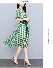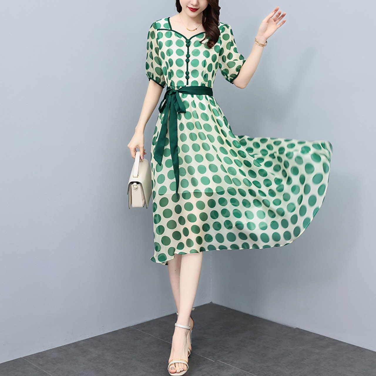 グリーンポルカドットシフォンドレス女性 2022 夏の老化防止ウエスト日焼け止め拡張ミディドレスサンドレス サマー 夏物