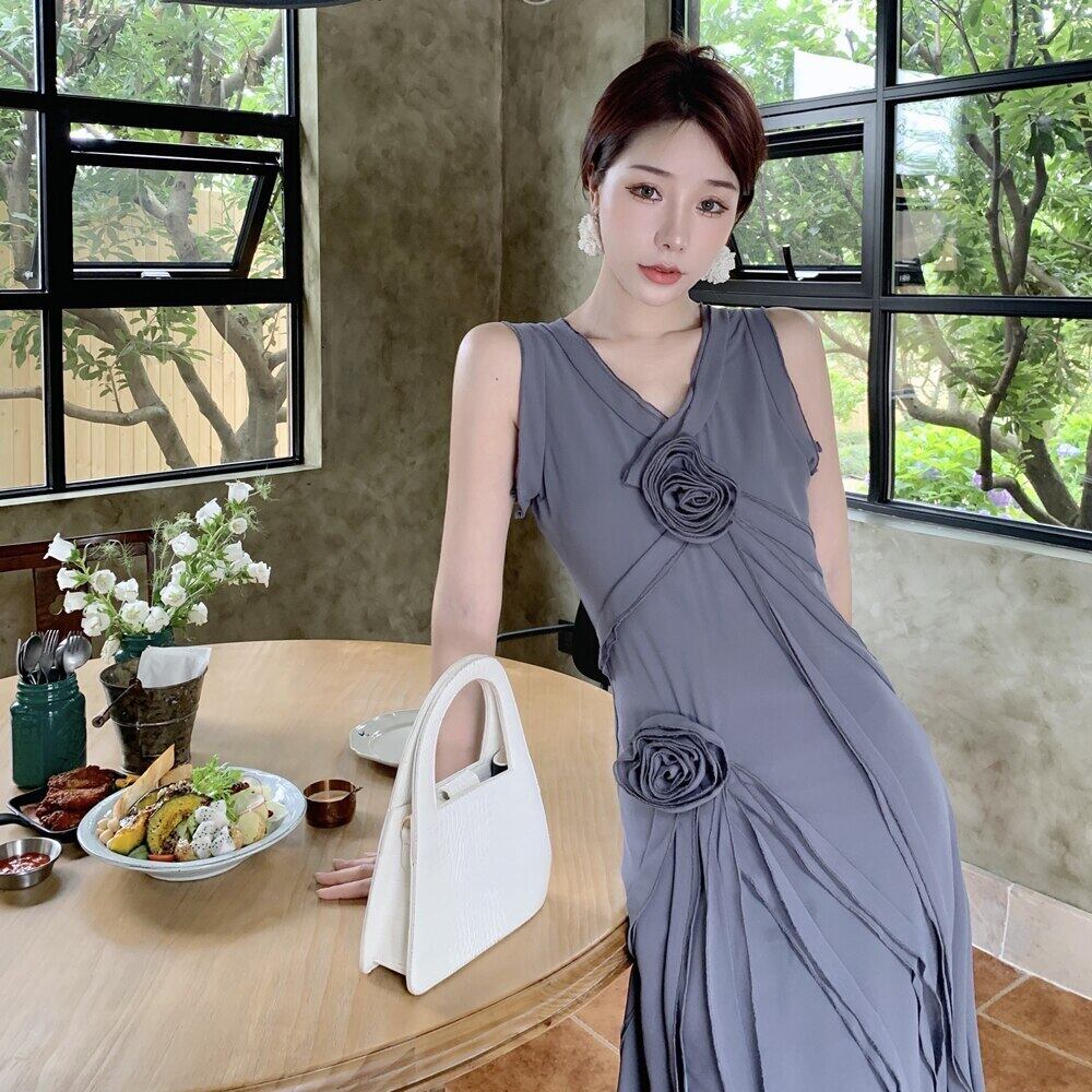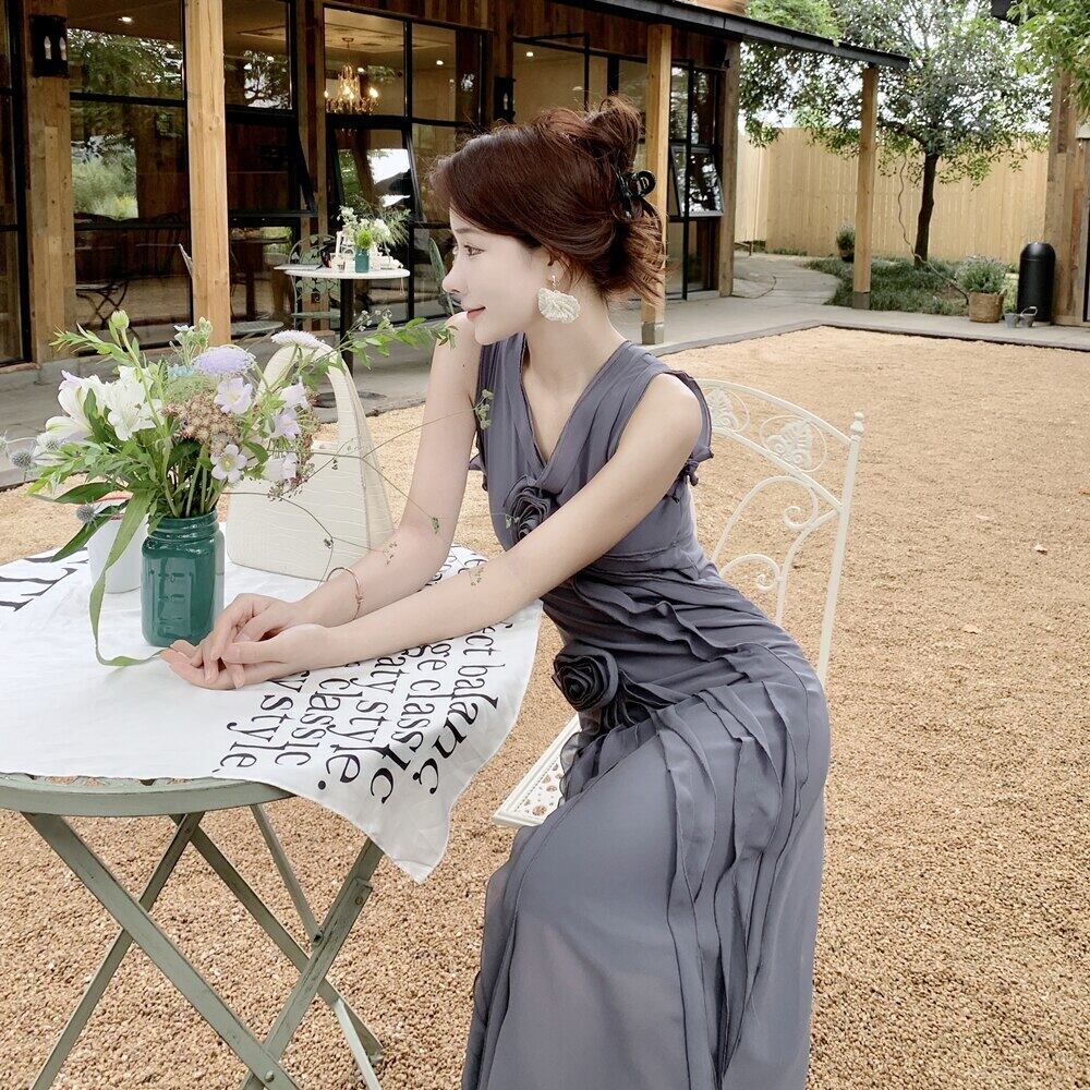 ランナウェイ シック レトロ ローズ スリング ドレス トレンド 年齢を減らす Vネック チュニック ウエストドレス パーティー サンドレス