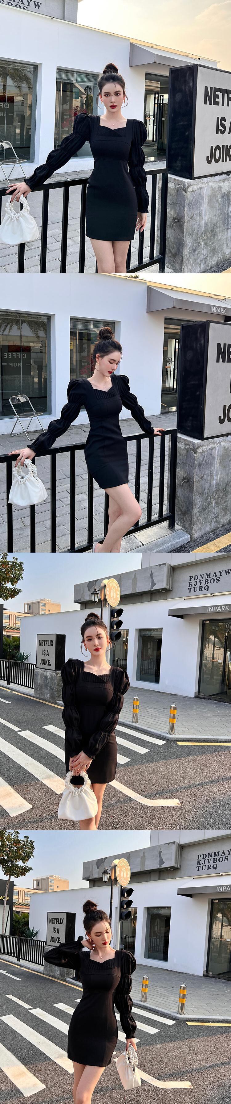スリムウエストミニドレス春女性ソリッドプリーツ長袖 V ネックパーティードレスボディコン服 ロング スプリング 春物 Vネック ソリッドカラー