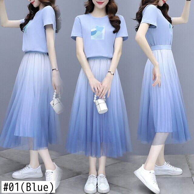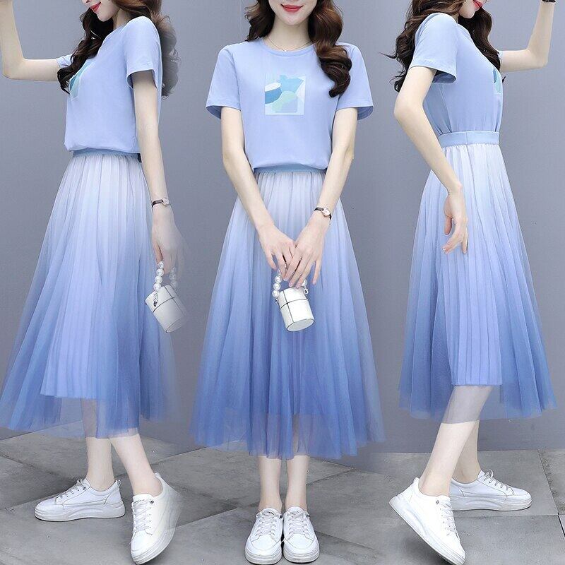夏ツーピース女性半袖プリント O ネック Tシャツ弾性ウエストメッシュプリーツミディスカート服セット ショート ハーフスリーブ エラスティック 伸縮 サマー 夏物 Oネック