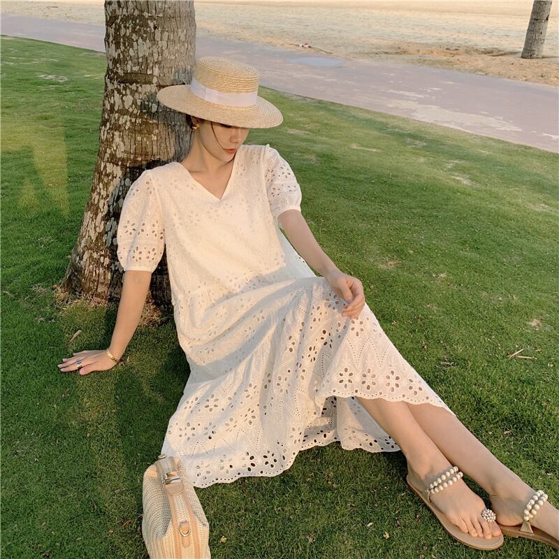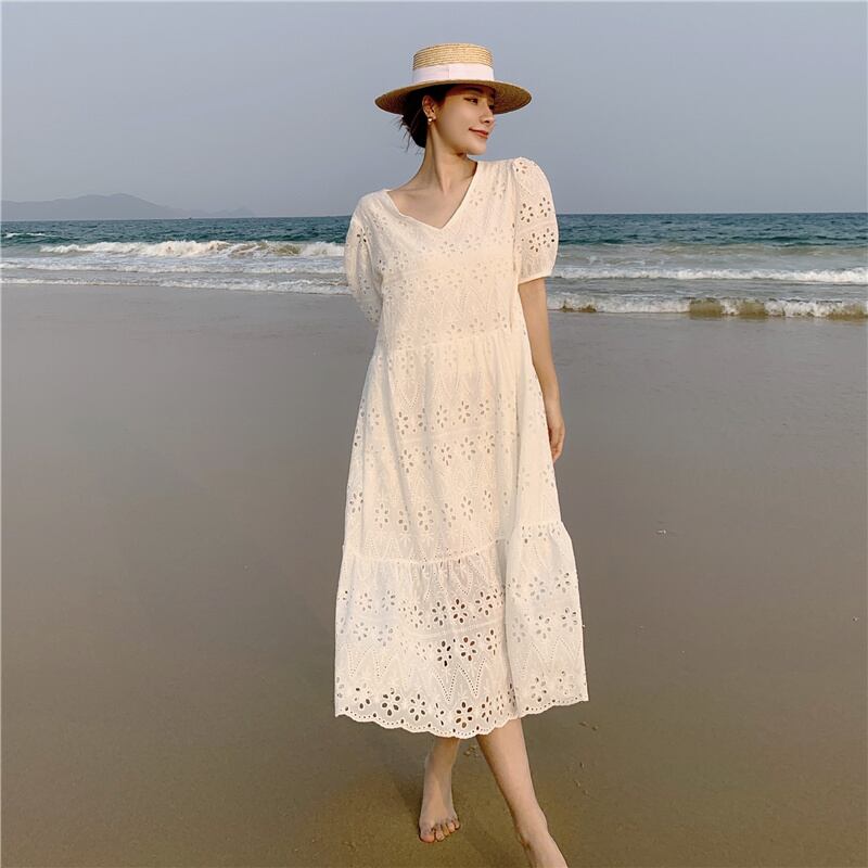 中空ルーズ V ネックドレス夏半袖刺繍ビーチホワイトサンドレス女性 Vestidos 服 ショート ハーフスリーブ サマー 夏物 Vネック