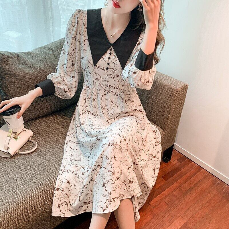 Y2K ドール 衿 花柄 大きいサイズ Aラインワンピース 秋 着痩せ 長袖 展開 薄手 シフォン 大振りワンピース ロング 大きめサイズ オータム 秋物
