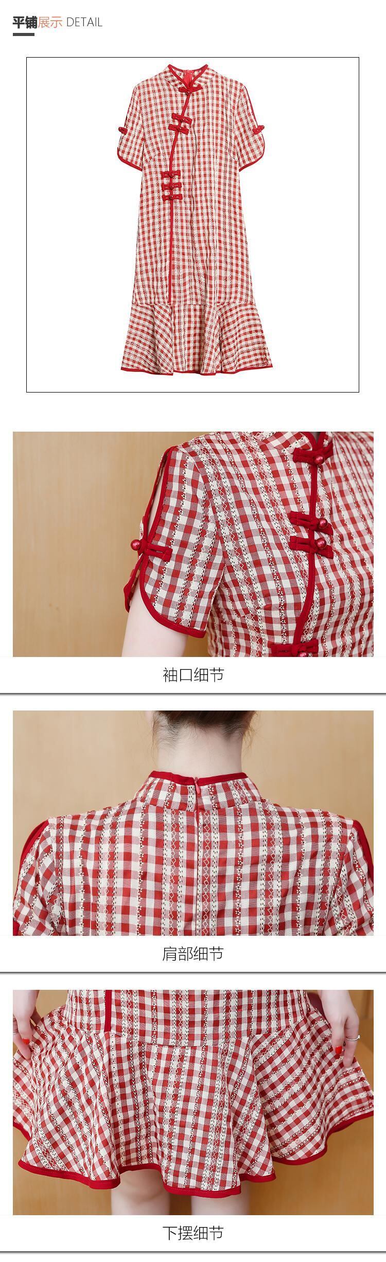 夏の中国風のミニドレス女性半袖チェック柄プリントスタンドカラーフリル現代チャイナドレス女性 ショート ハーフスリーブ ラッフル サマー 夏物