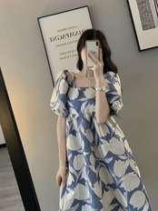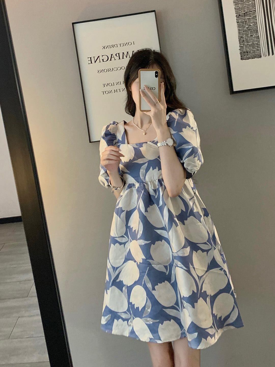 夏 2022 シックなプリント スクエア ネック半袖ドレス女性 ショート ハーフスリーブ サマー 夏物 スクウェア