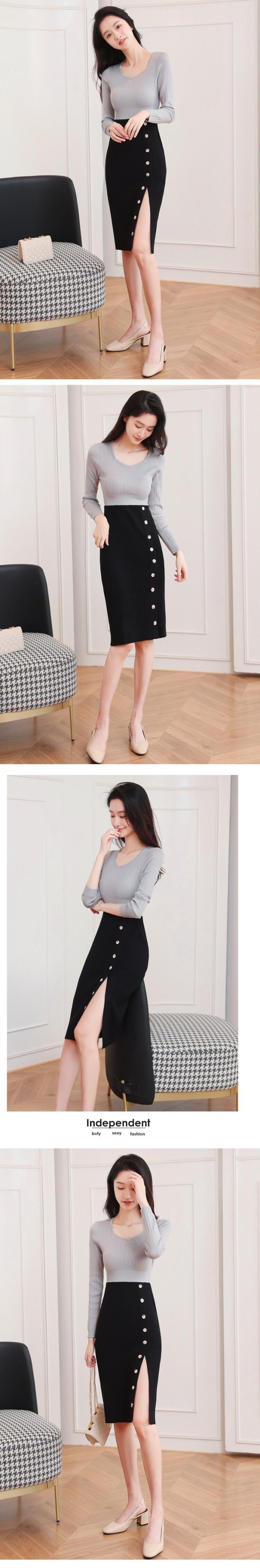 秋のスプリットニット長袖ラウンドネック Tシャツ黒バッグヒップボディコンドレススリムセーター底入れスカート 2 点セット ロング ブラック オータム 秋物 Oネック