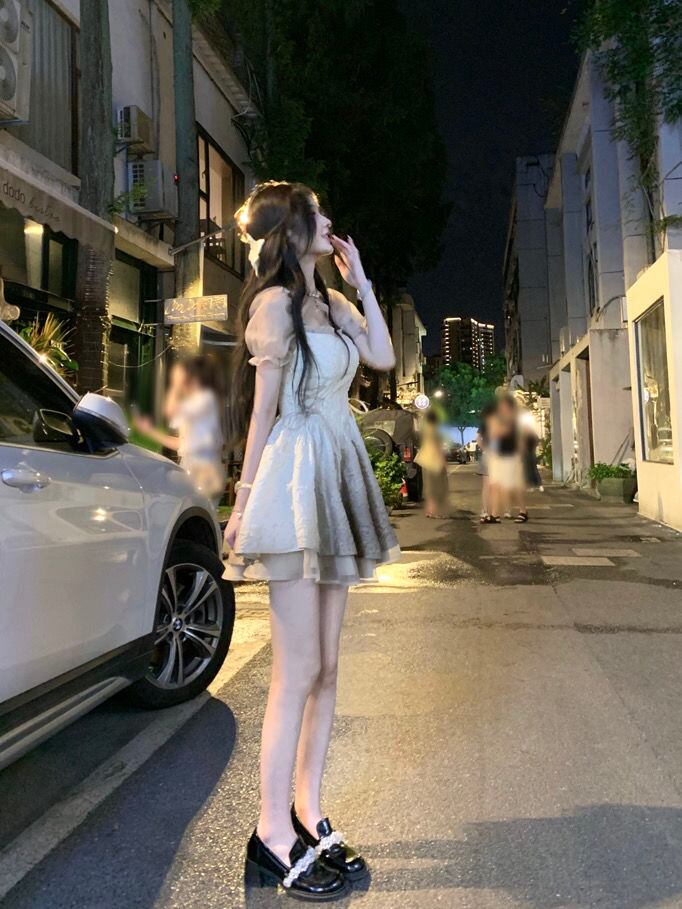 森甘い女の子のショートパフスリーブグラデーションメッシュドレス女性の夏のキャラクタースクエアネックパーティーミニドレス 大人ガーリー スウィート キュート カジュアル サマー 夏物 スクウェア