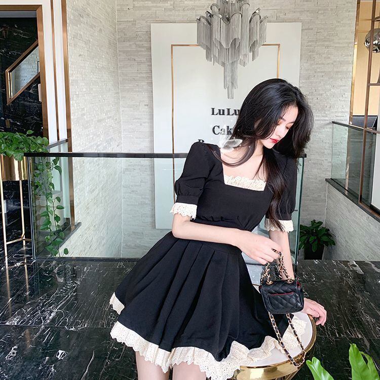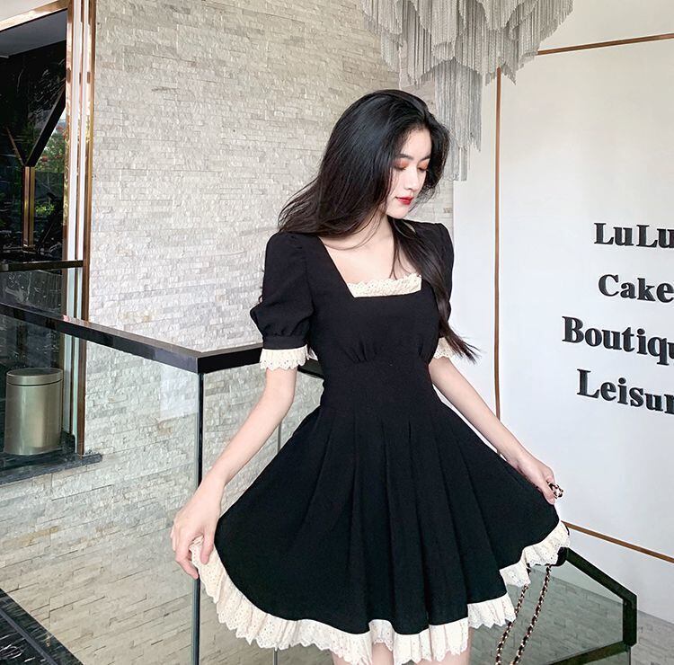 レースパッチワークスクエアカラードレス女性 2022 夏半袖ウエストパーティーミニドレス Vestidos ショート ハーフスリーブ サマー 夏物 スクウェア
