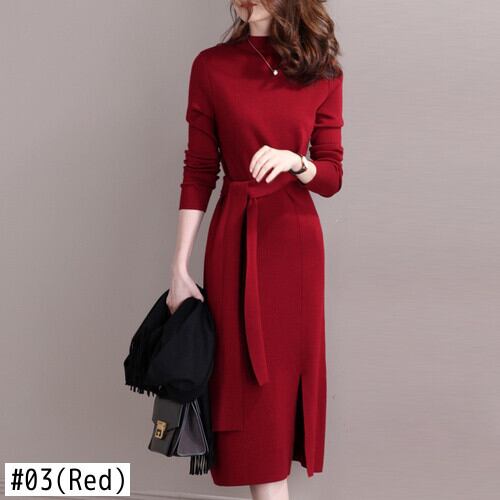 2022 秋冬シンプルでスリムなセータードレス女性の赤黒ハーフタートルネックニットドレス レッド ブラック オータム 秋物 ウィンター 冬物