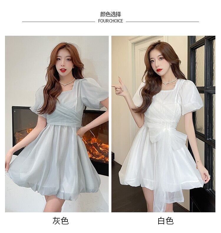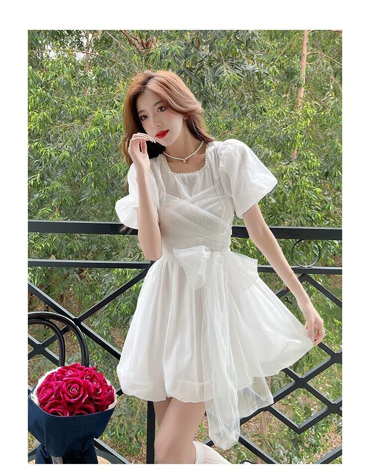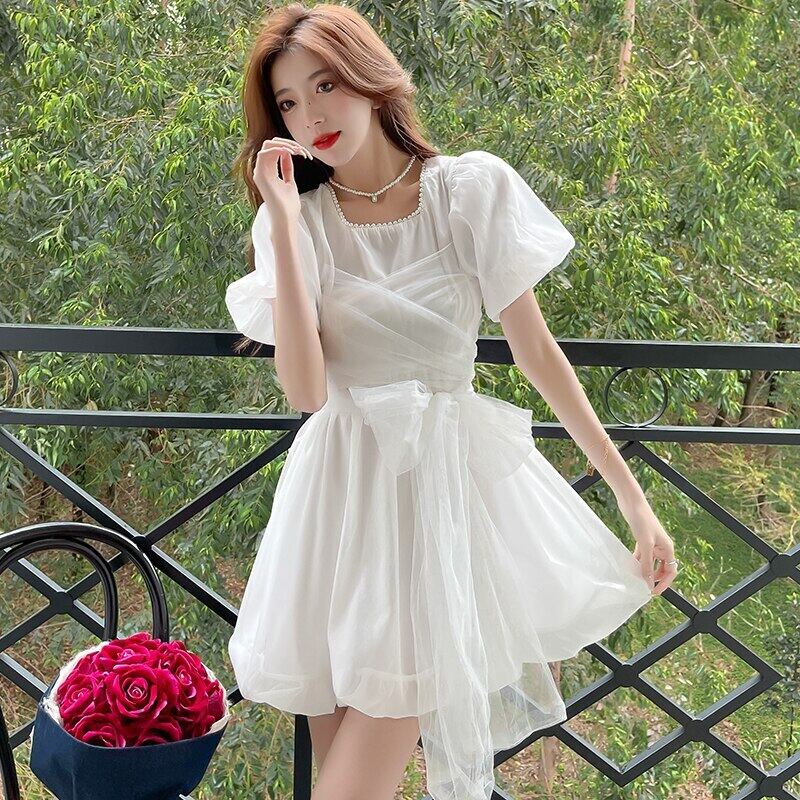 2022夏ウエストスリムレトロスクエアネックパフスリーブレースドレスホワイトブルーチュールミニチュチュドレス サマー 夏物 パニエ ペチコート スクウェア