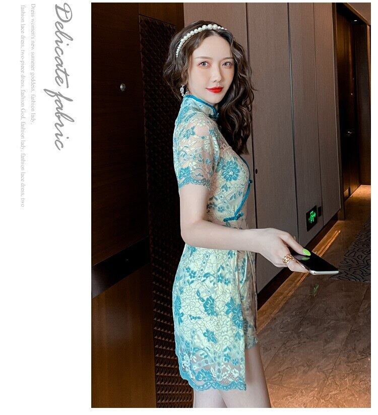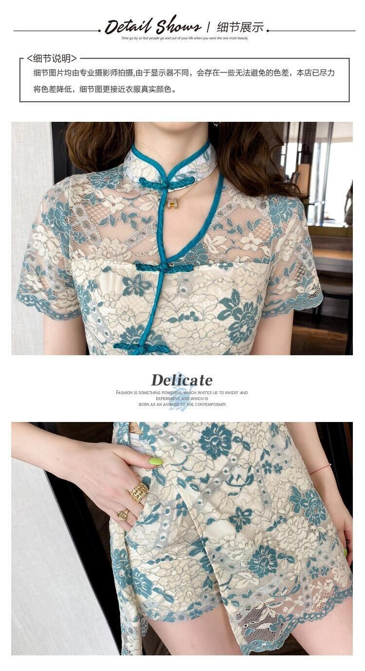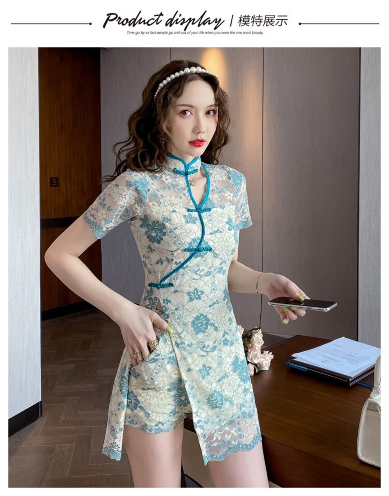 レースのセクシーな中空スプリット 18k 改良されたチャイナトップショーツ女性の夏のスリムな服セット 2021 レトロ 2 ツーピーススーツ サマー 夏物 ブルマー