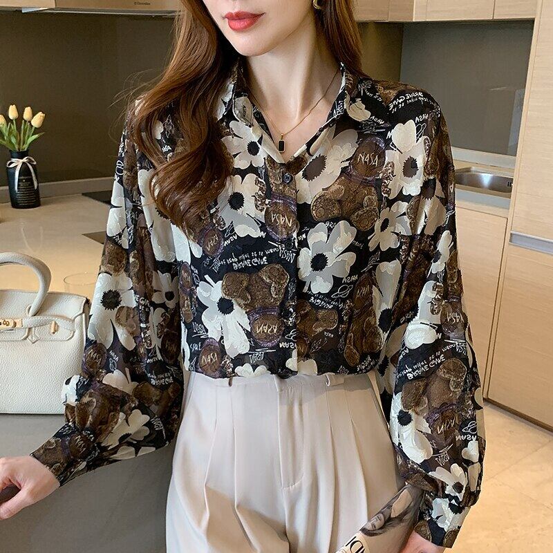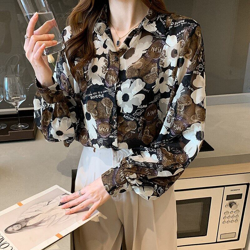 花柄薄いシフォンブラウス春長袖ターンダウン襟ボタンアップ女性フレンチシャツトップ ロング スプリング 春物