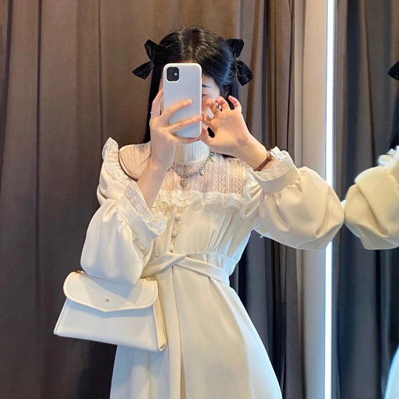 フランスのレースのドレスの女性フグスリーブワンピースドレス 2021 春ストリートスリムミディドレス スプリング 春物