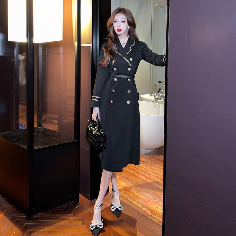 Awarose 春女性ミッドロングトレンチ気質ターンダウン襟ダブルブレストスリットレディオフィスドレス vestidos スプリング 春物 会社 学校 通勤や通学にも