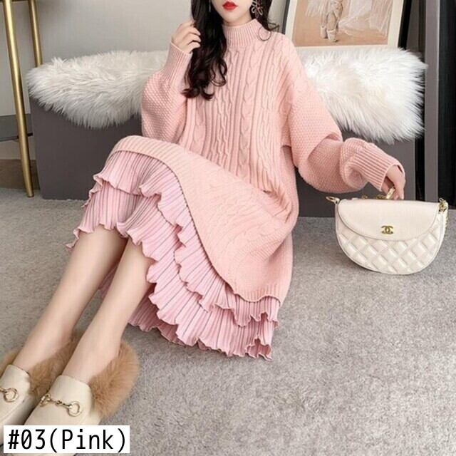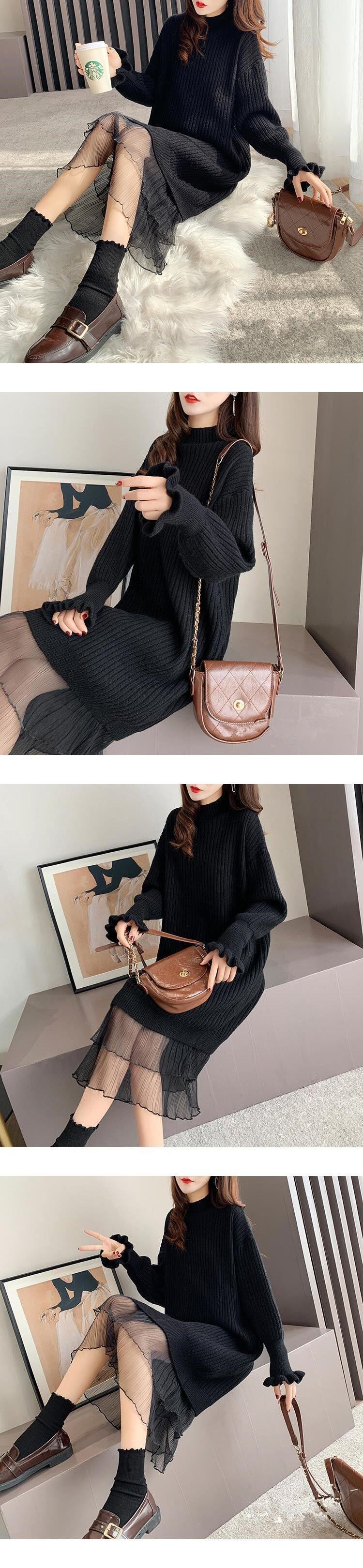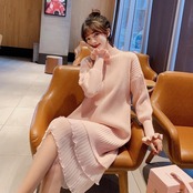 秋冬プリーツメッシュパッチワークニットドレス女性長袖タートルネックセーターミディドレス ロング オータム 秋物 ウィンター 冬物