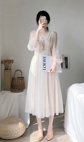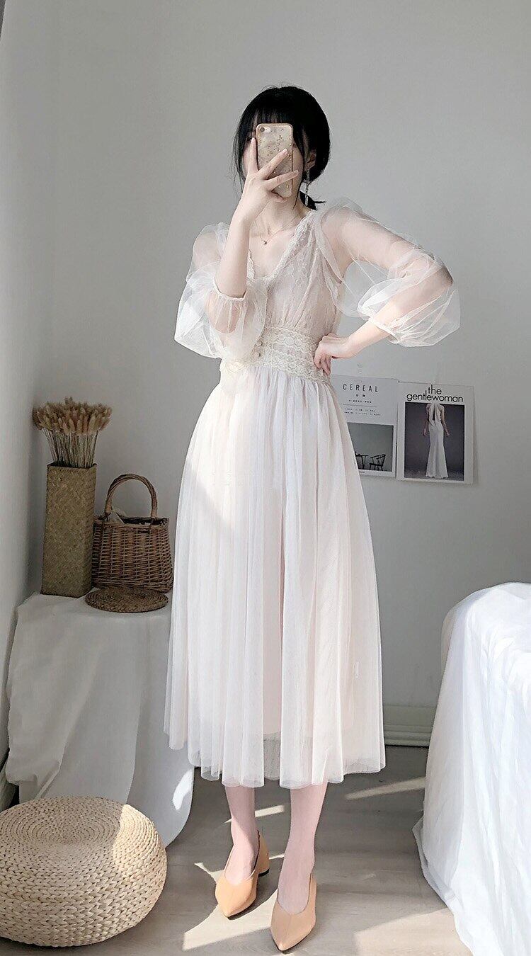 ドレス女性の夏のドレススリムウエスト A ライン Vestido ソリッドパフスリーブエンパイア V ネックレースドレスメッシュ サマー 夏物 Vネック Aライン ソリッドカラー