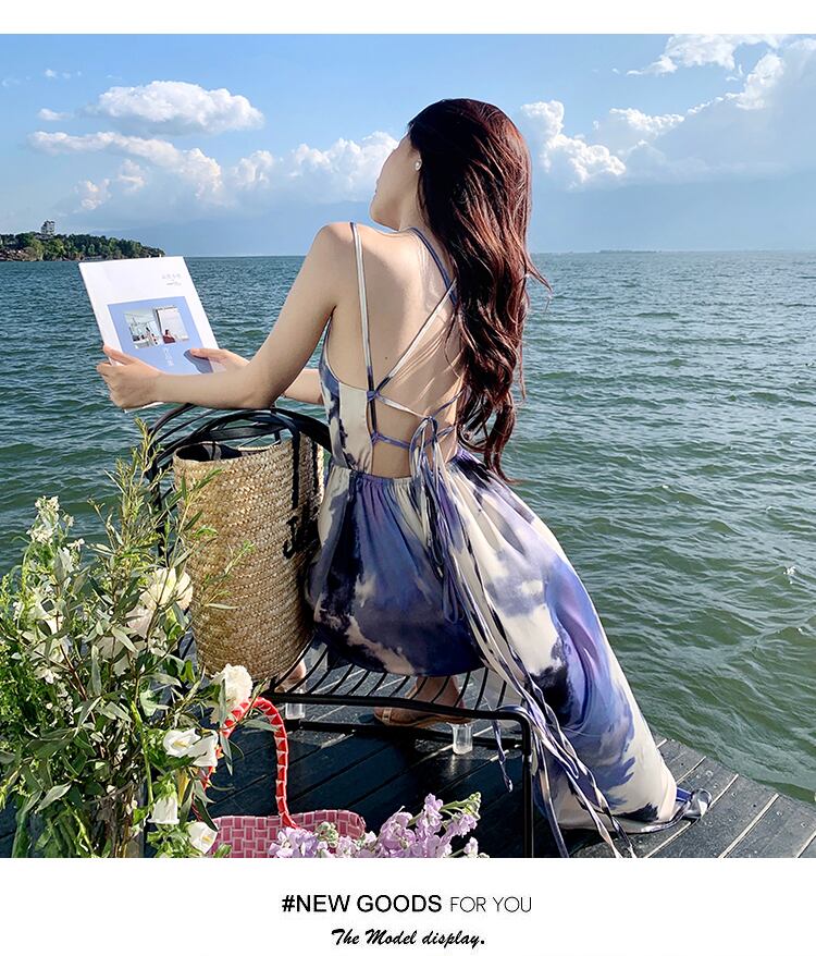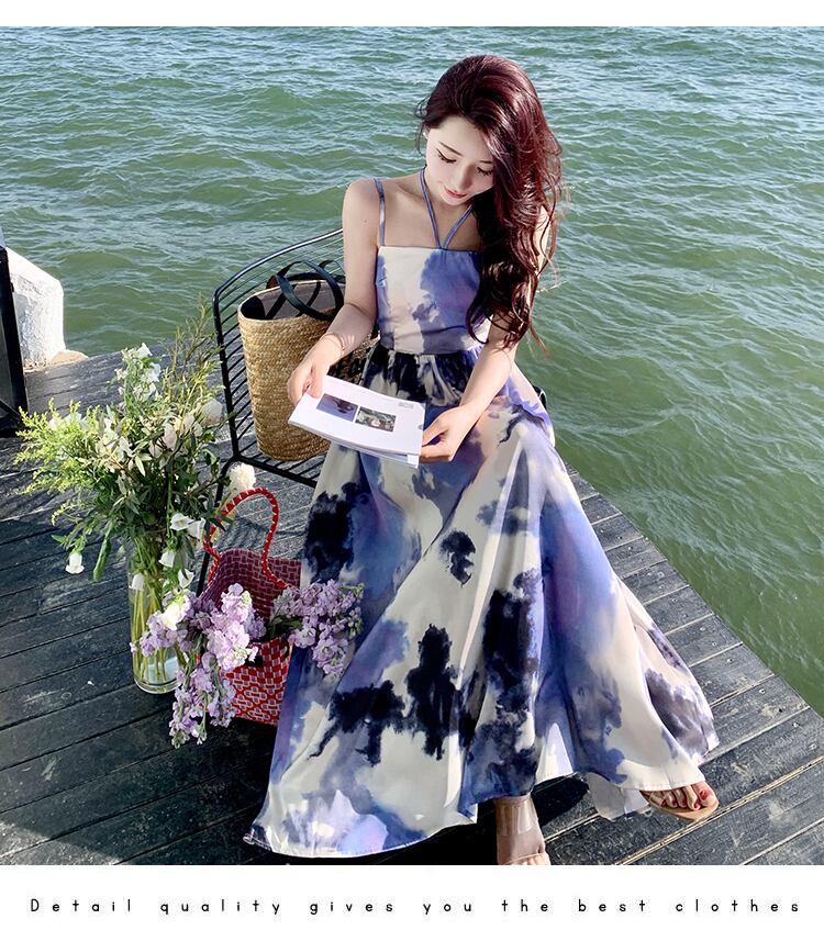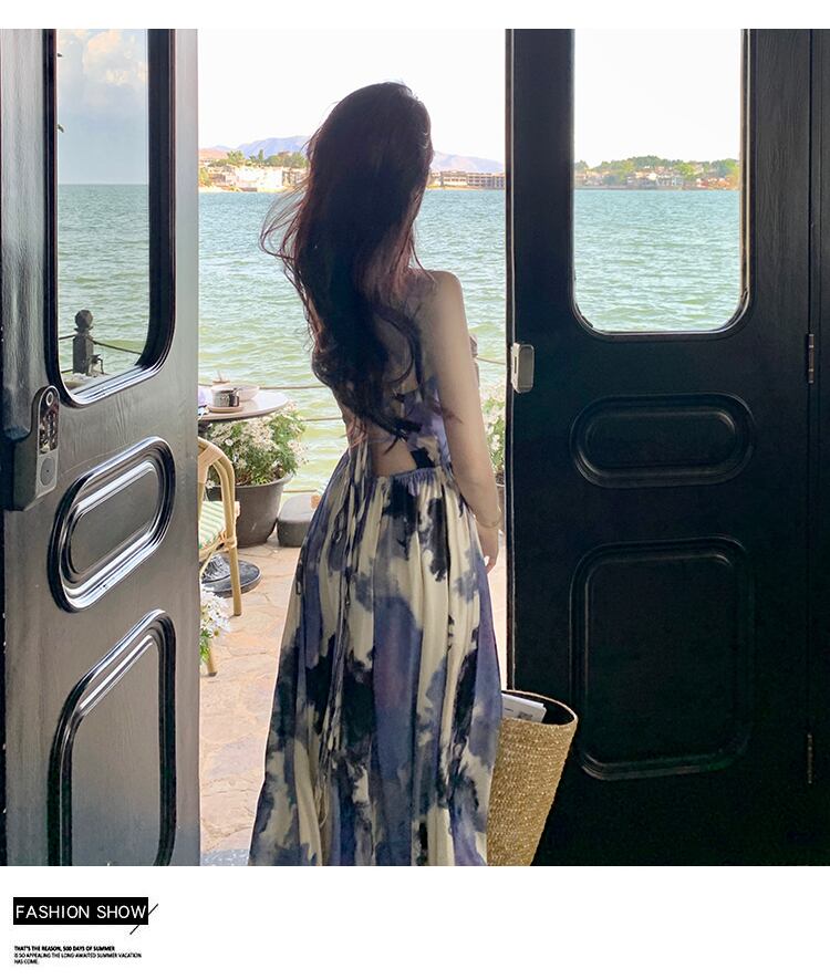 Y2Kボヘミアンバンデージビッグスイングプリントビーチドレスサマーシーサイドホリデーバックレス拡張サスペンダーサンドレス 夏物