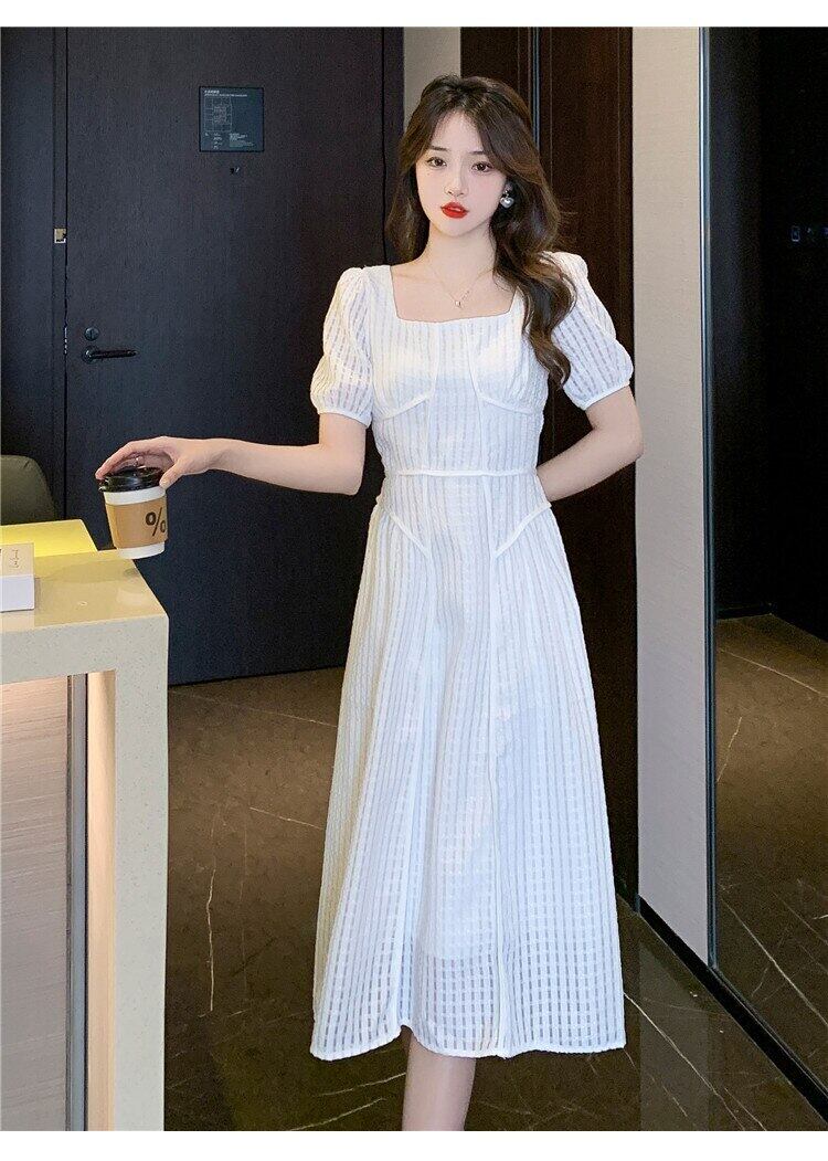 Y2K 2022 夏半袖ホワイト スクエア ネック ドレス女性スウィート スリム テクスチャ ミディ Vestidos ショート ハーフスリーブ 大人ガーリー キュート カジュアル サマー 夏物 スクウェア