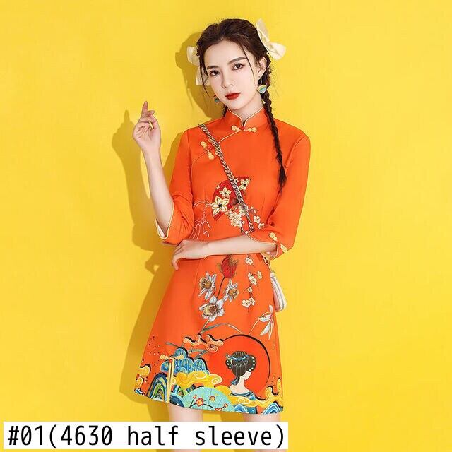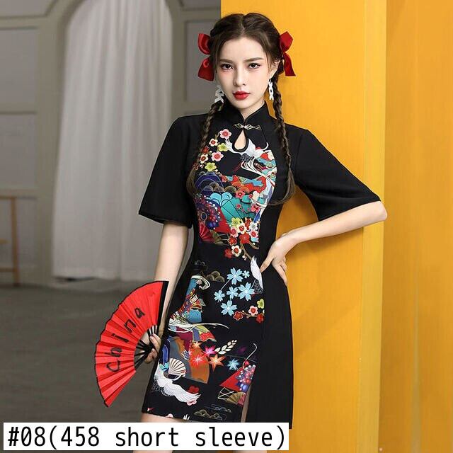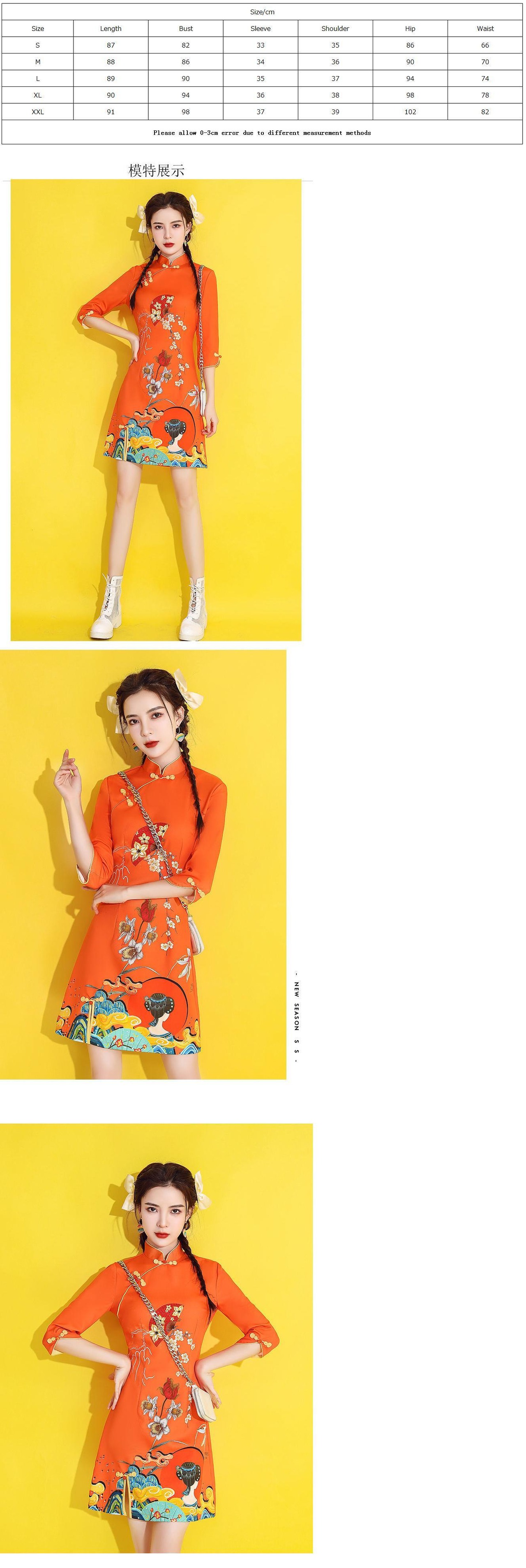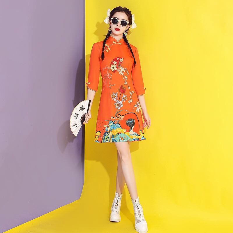 印刷現代袍夏スリムスタンドカラーバックルチャイナドレス女性中国風の A ラインミニドレス サマー 夏物 Aライン