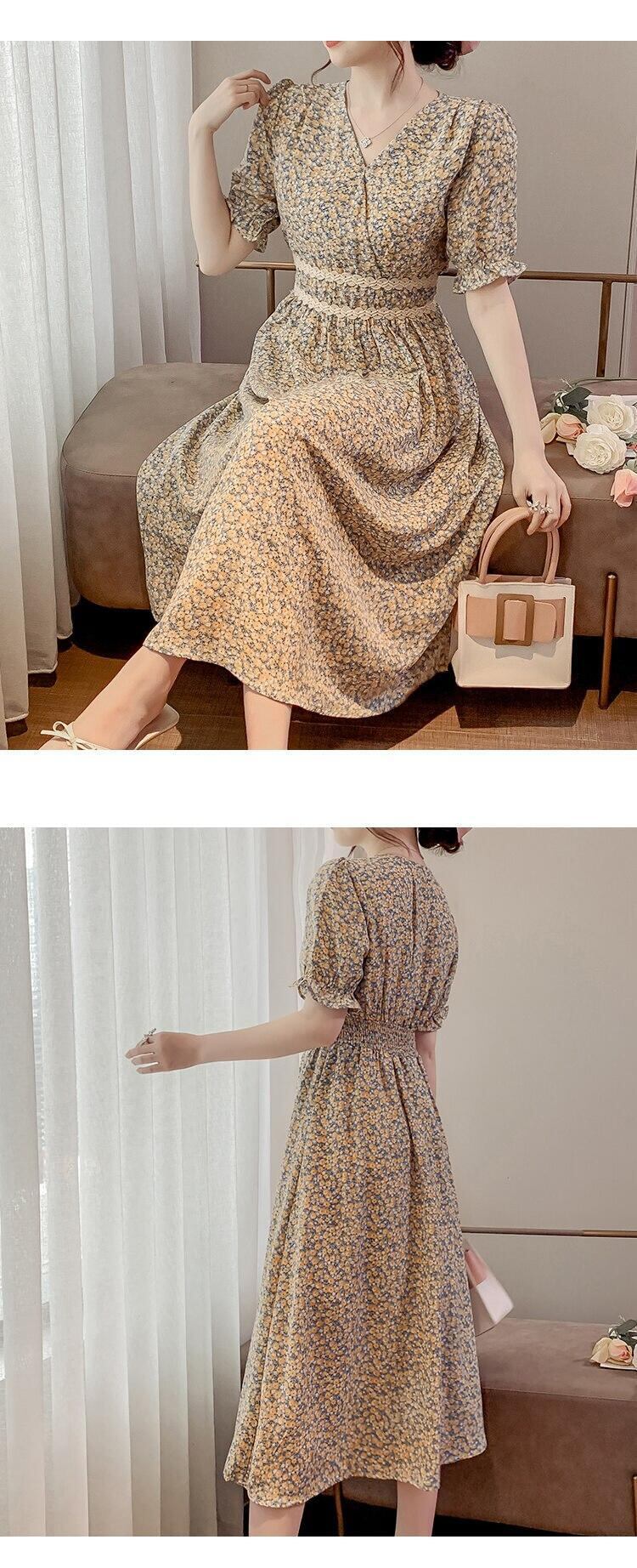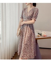 フランスの小さな花柄ウエスト シフォン女性のドレス夏プラス サイズ V ネック半袖ミディ ドレス茶 4xl ショート ハーフスリーブ 大きめサイズ サマー 夏物 Vネック