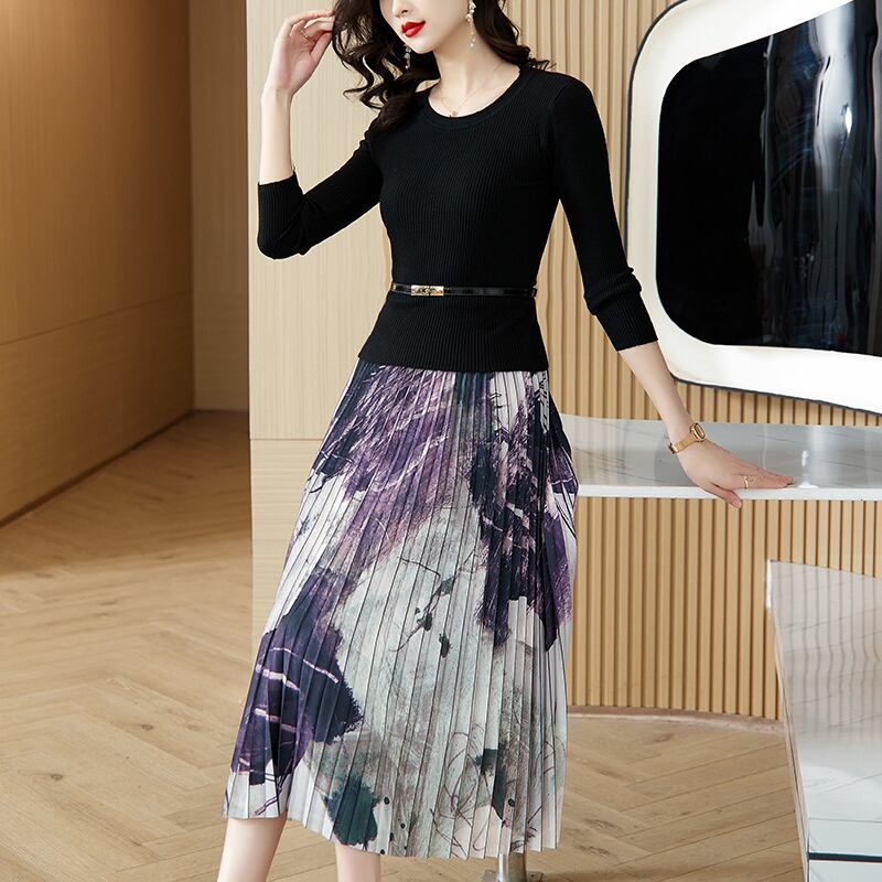 2022 秋冬ニットトップ + プリントプリーツプリーツスカート三宅プリーツツーピースセット女性スーツ オータム 秋物 ウィンター 冬物