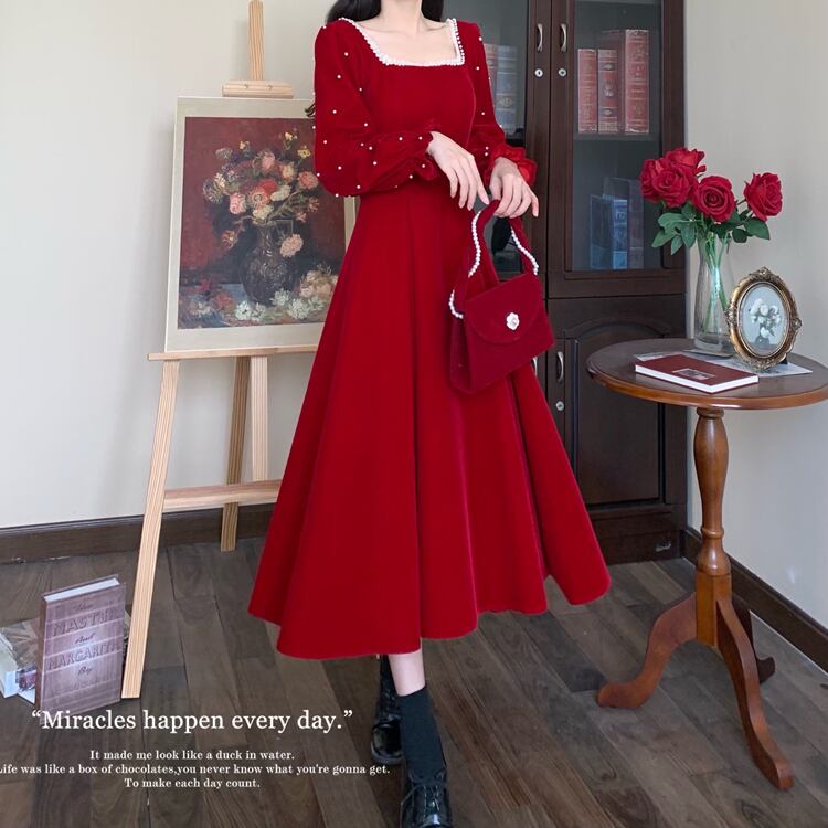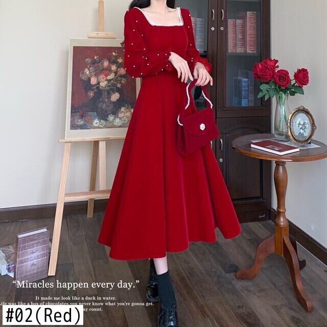 2023 旧暦赤黒プラスサイズのドレス春と秋の長袖スクエアネックヘップバーンスタイルのベルベットのドレス ロング レッド ブラック 大きめサイズ スプリング 春物 オータム 秋物 スクウェア