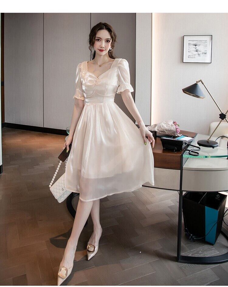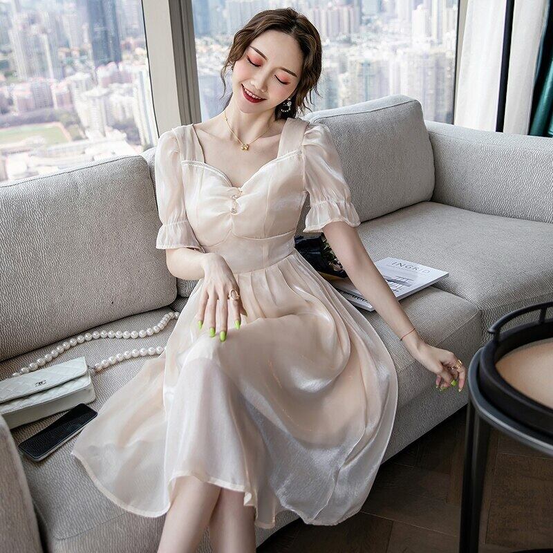 2022 フレンチウエストウエスト薄型シックな甘い妖精ミディストリーマシフォンスクエアネックプリーツティードレス女性 大人ガーリー スウィート キュート カジュアル スクウェア