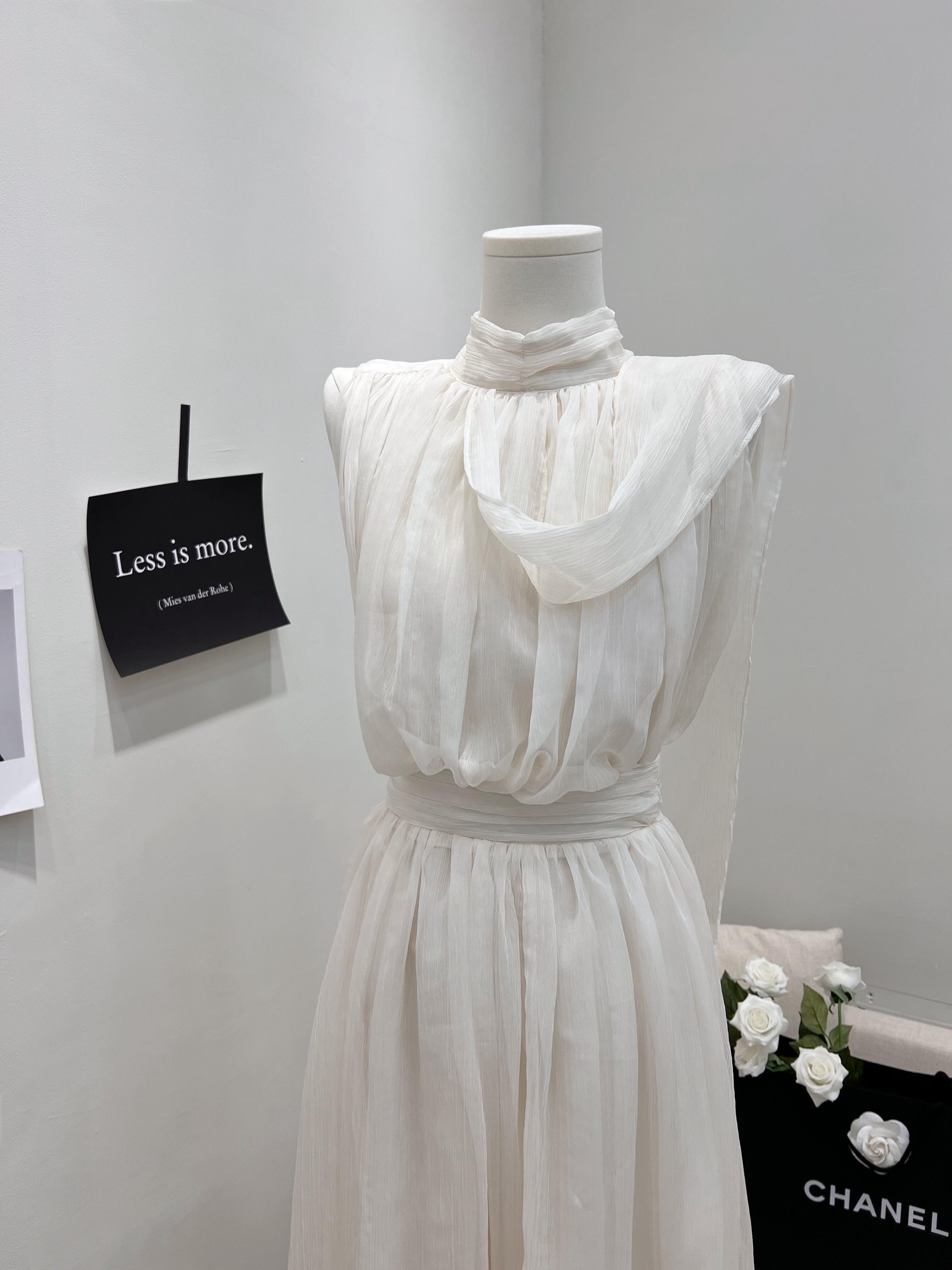 Y2K ノースリーブ シルク リボン ドレス スーツ 2022 ホワイト プリーツ トップ + ウエスト スカート 夏 2 ピース 衣装 女性 サマー 夏物