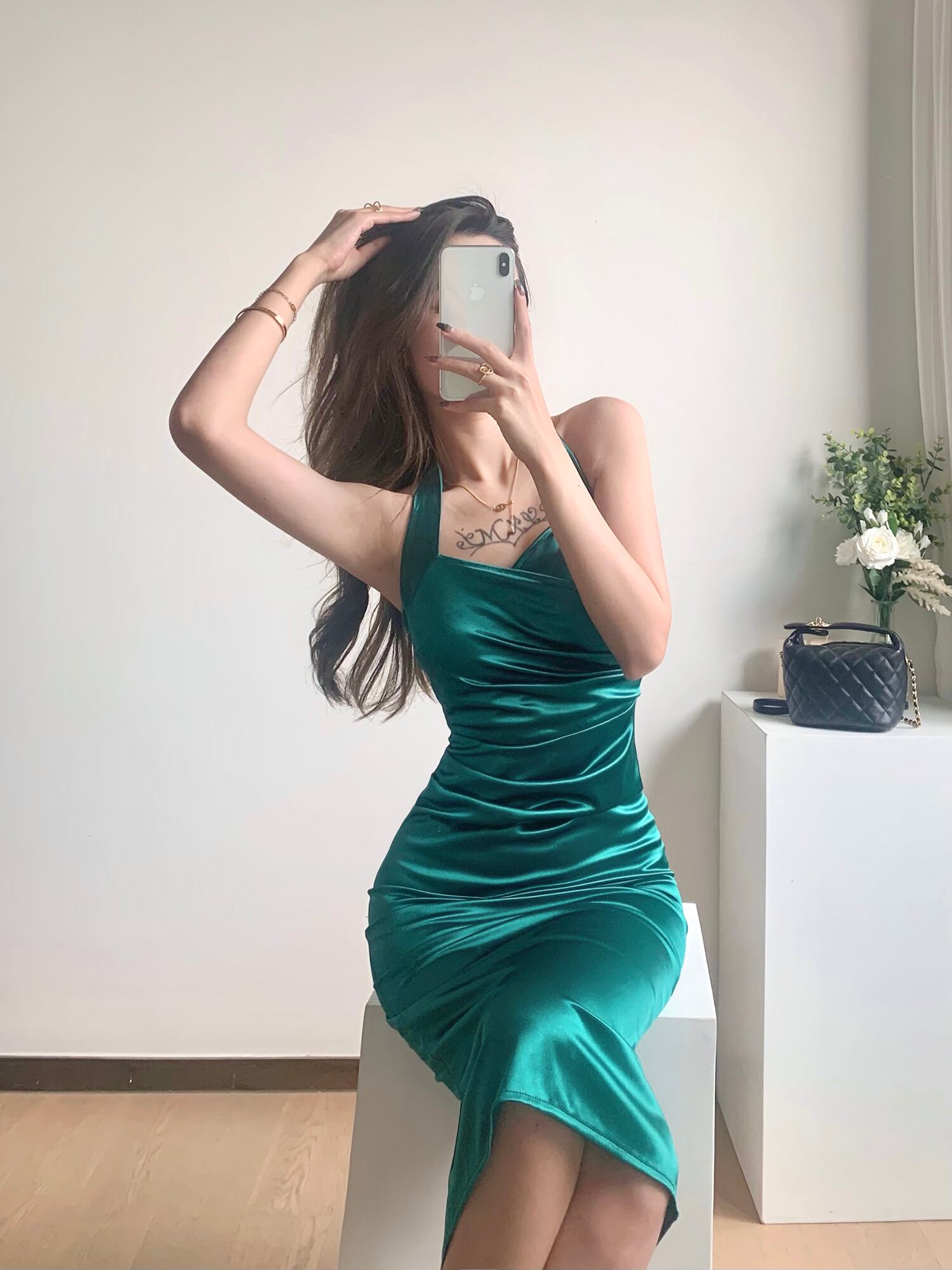 オフショルダーホルター V ネックタイトな薄いボディコンドレス 2022 女性のソリッドサテンのイブニングドレスセクシーな衣装 Vネック ソリッドカラー