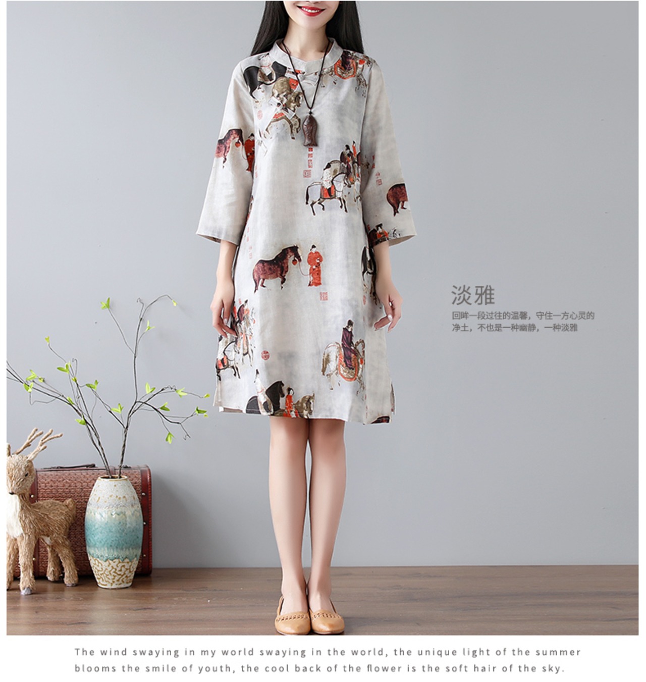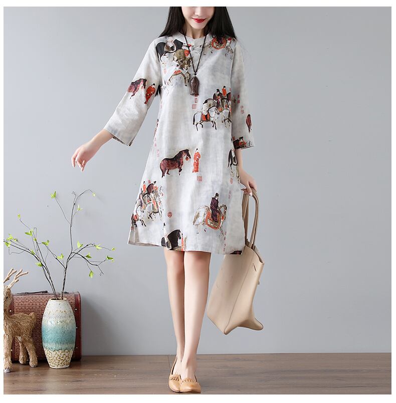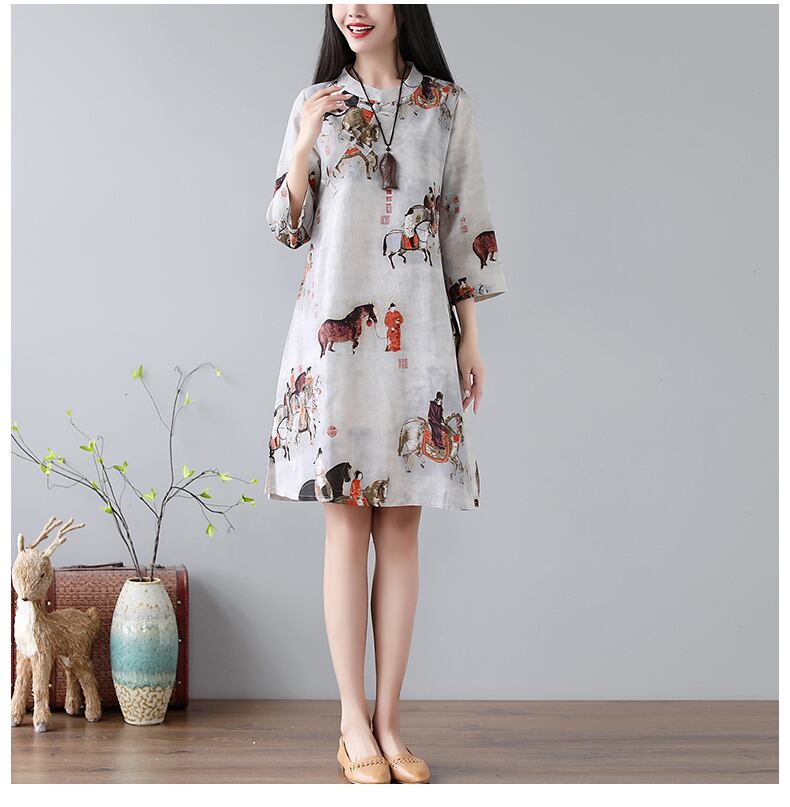 中国のレトロなプリントコットンとリネンルーズラージサイズミッドレングス改良チャイナドレス唐王朝プリントドレス 大きめサイズ
