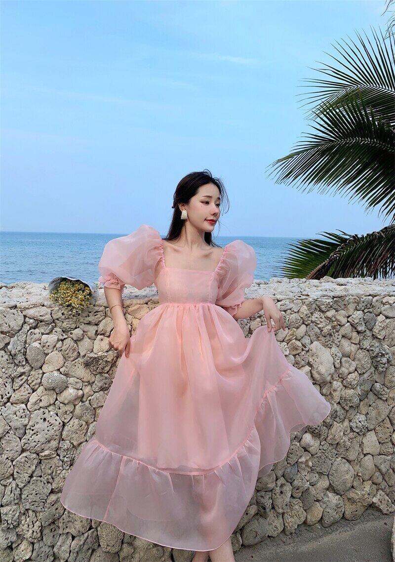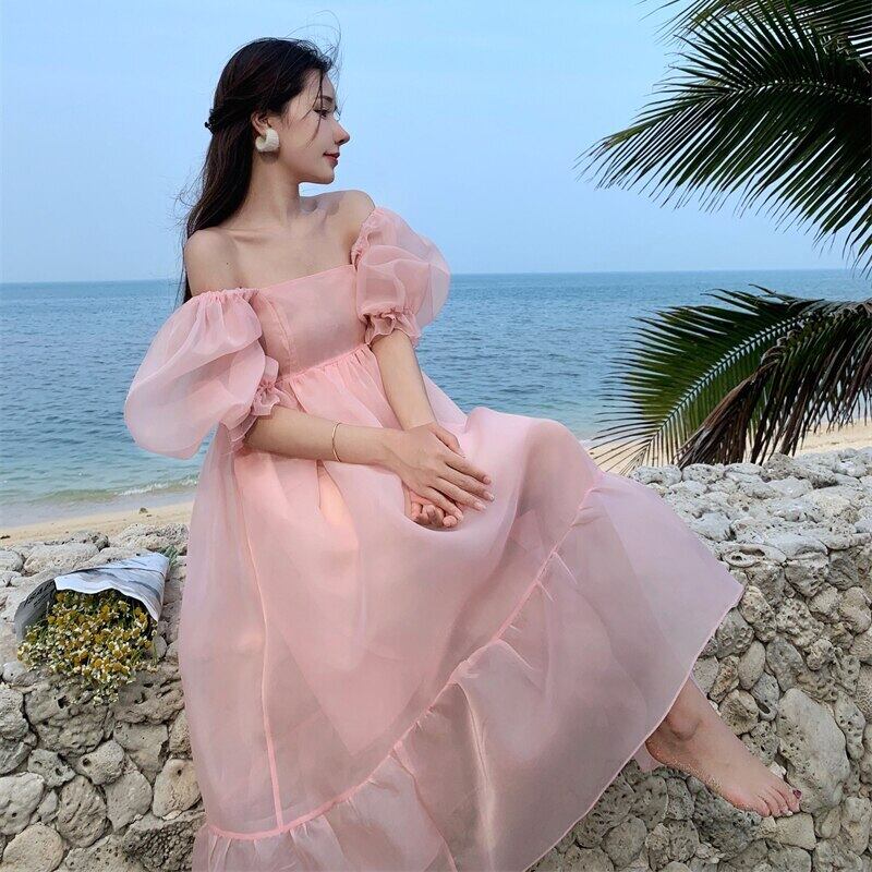 オフショルダーピンクパフスリーブふくらんドレス夏ウエストミディドレス 2022 女性背中の開いたサンドレス サマー 夏物