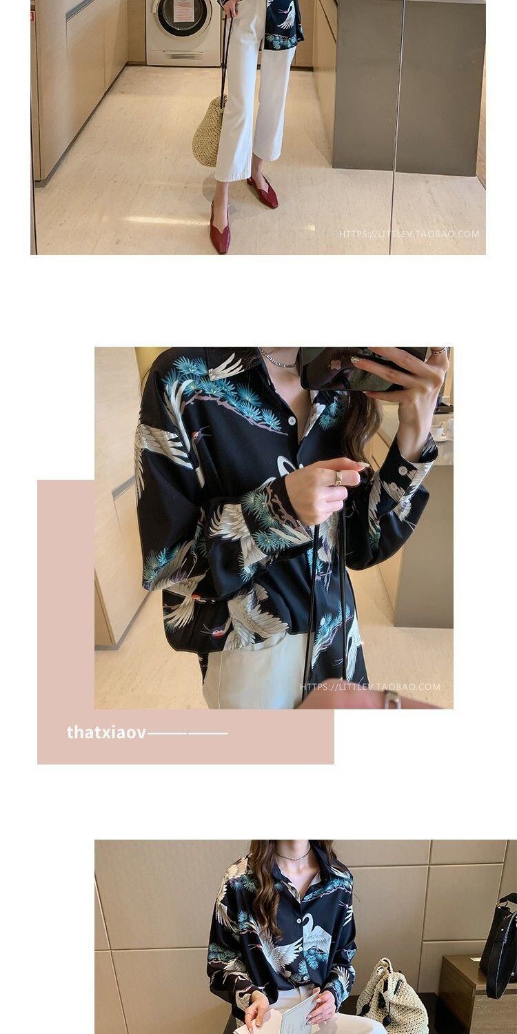 2021 秋長袖クレーンプリントブラウス女性ターンダウン襟シングルブレストルーズシャツトップ ロング オータム 秋物