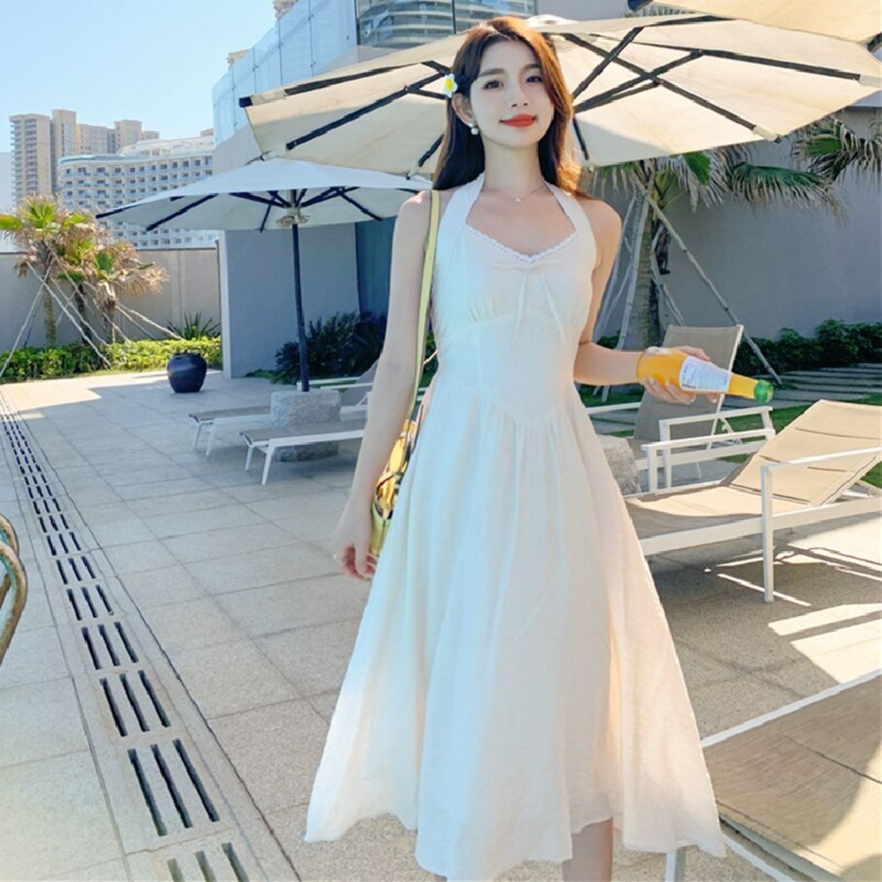 フランスのレトロなホルターネックウエストサスペンダー女性の背中の開いた夏の白い結婚式のイブニングカクテルドレス休暇サンドレス ホワイト サマー 夏物