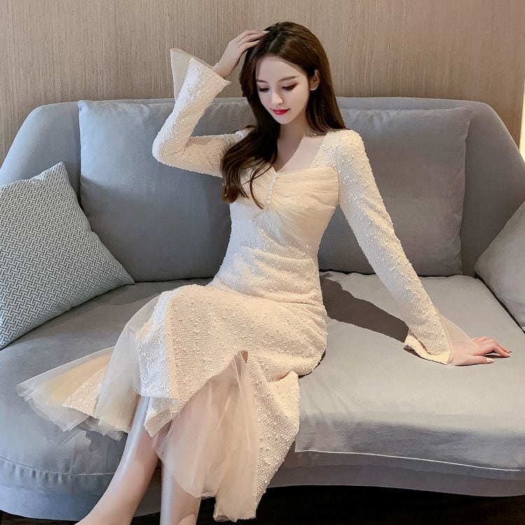 2023 秋と冬のセクシーなフレンチスリムミッドレングス底入れドレス女性の Y2K ベージュフィッシュテールドレス オータム 秋物 ウィンター 冬物