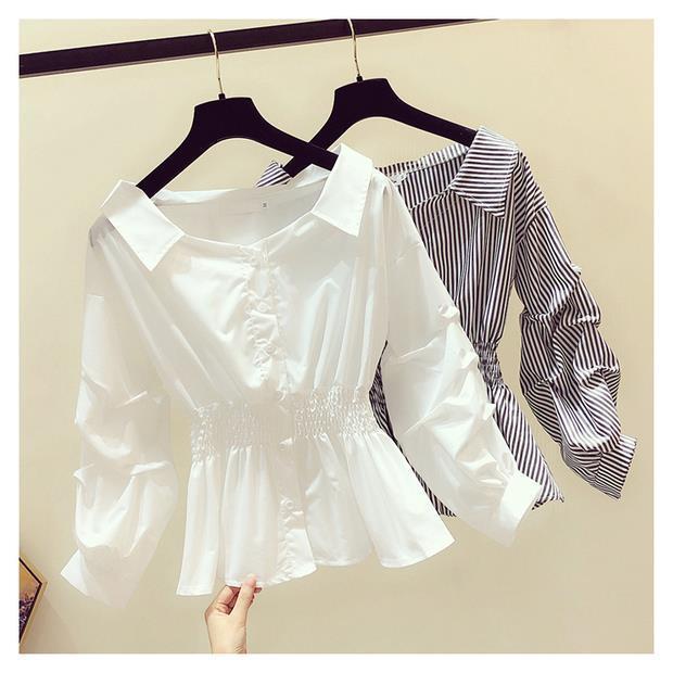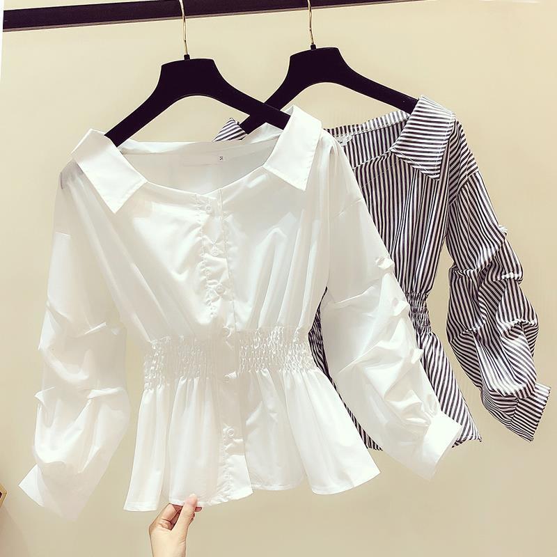 2023 春と秋のパフスリーブ白黒シャツ女性のウエスト痩身長袖トップ小さなシャツ ロング ホワイト ブラック スプリング 春物 オータム 秋物