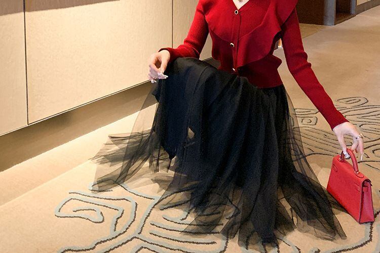 レディース 2点セット:イレギュラーハスリーフカラー シングルブレスト ニットカーディガン+メッシュスカート 2点スカートセット レディース