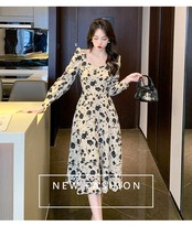 黒花プリント ベージュ ドレス女性長袖スクエア カラー ポケット ドレス ミディ ドレス Vestido ロング ブラック フラワーデザイン スクウェア