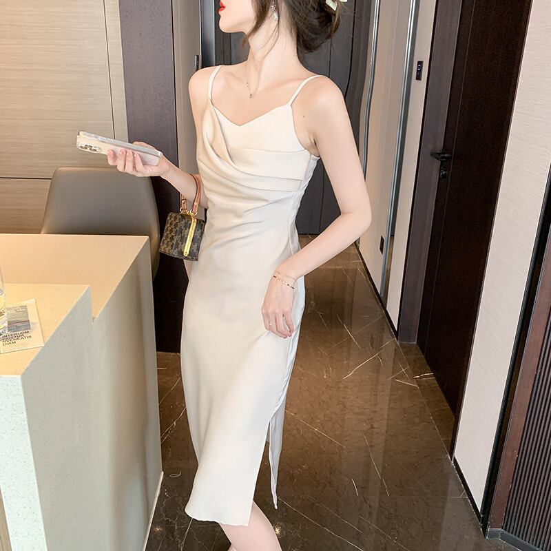 夏のストラップサテンドレス女性スタイルのショルダーオフプリーツセクシーなスリングドレスパーティージッパースリムドレス サマー 夏物