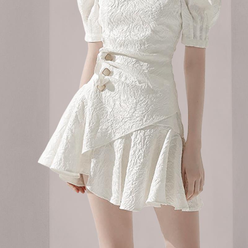 夏スリムパフスリーブボタンしわミニドレス女性ジッパー不規則な襟ウエストスリム A ラインドレス サマー 夏物 Aライン