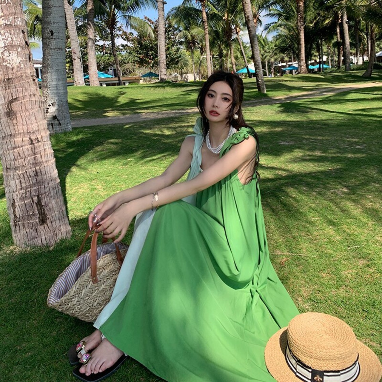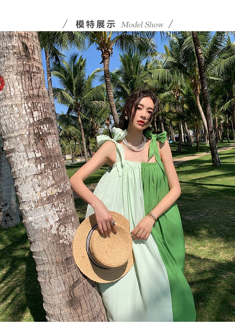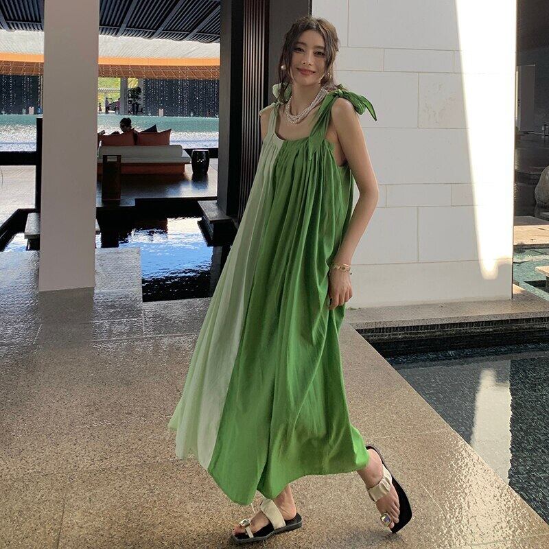 グリーンスリングロングドレス女性ノースリーブカラーコントラスト夏ルースドレスボヘミアンビーチドレス サマー 夏物