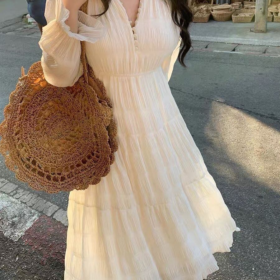 春と夏のプリーツ ミディ ドレス Y2K 女性長袖 V ネック ドレス ルーズ ローブ パーティー ドレス ロング スプリング 春物 サマー 夏物 Vネック