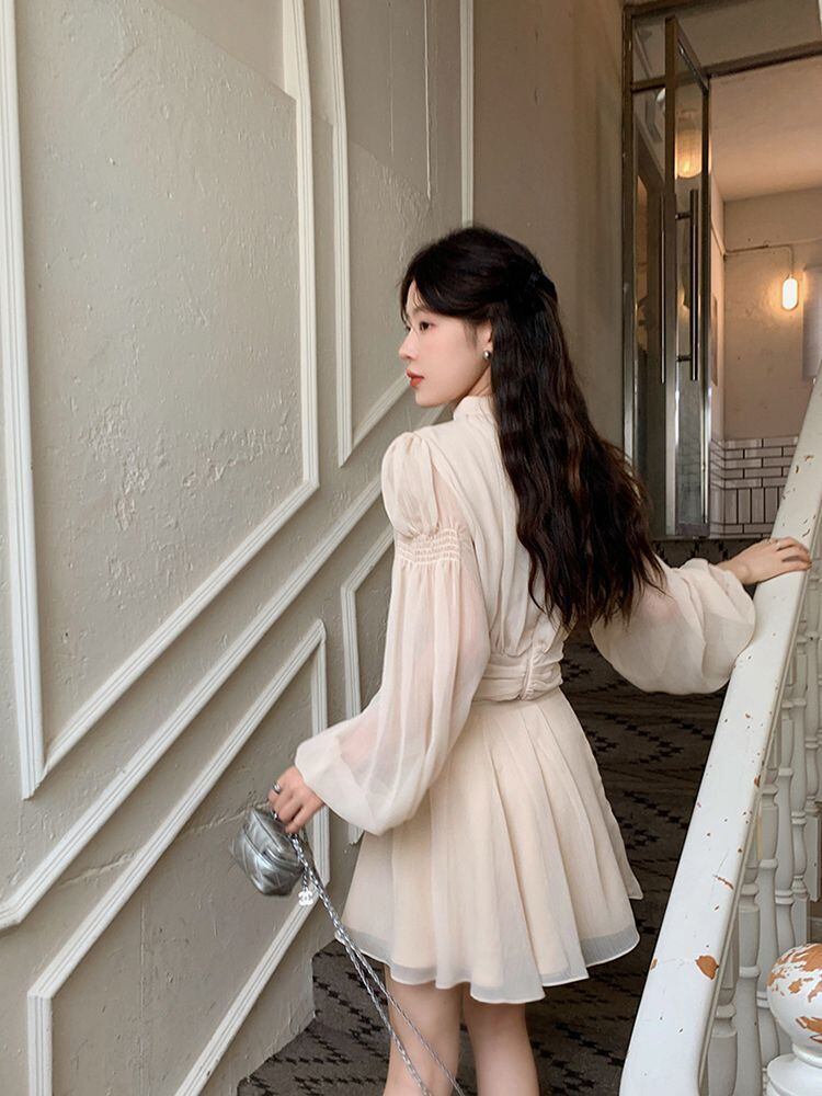 スプリングシマーレディースツーピースセット:フレンチスタイルランタンスリーブタートルネックシックブラウス+無地ミニチュニックスカート2点衣装セット 春物 ソリッドカラー
