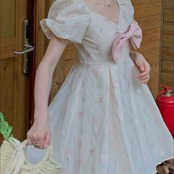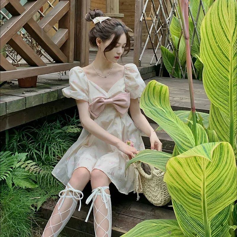 Y2k ase スタイルビッグボウパフスリーブスウィートドレス女性スクエアカラープリントスリムチュニックミニ妖精ドレス リボン 大人ガーリー キュート カジュアル スクウェア