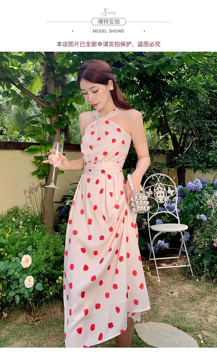 オフショル×クロス水玉シフォンドレス 夏フレンチレトロウエスト感 首元ニッチティードレス パーティー サマー 夏物