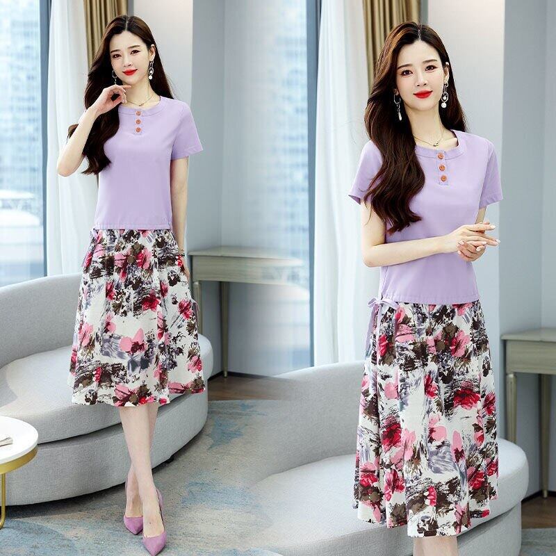 シンプル文学ツーピースセット女性:クリックコットンとラインTシャツ+アブストラクトプリント膝丈スカート2点女性セット