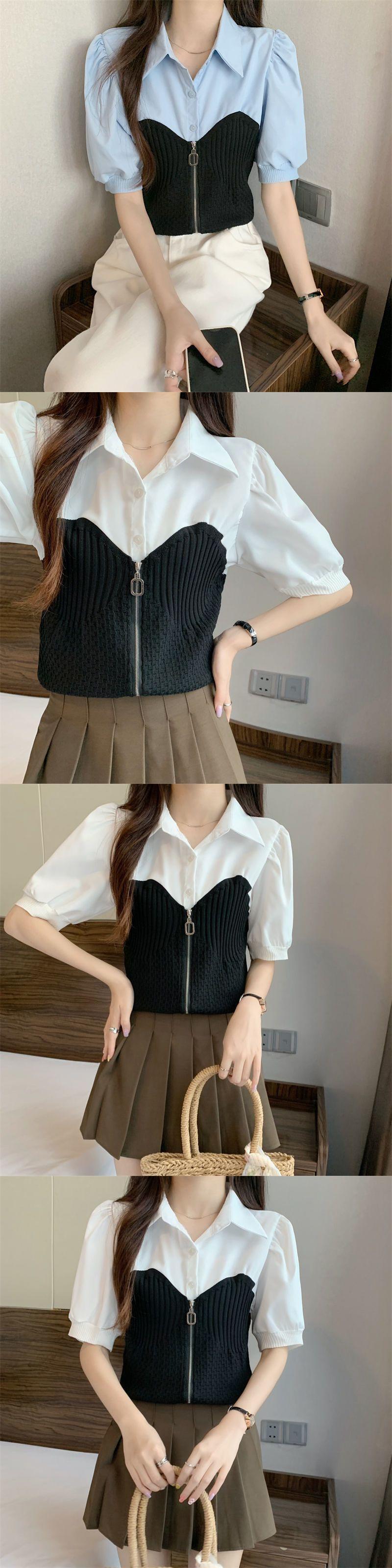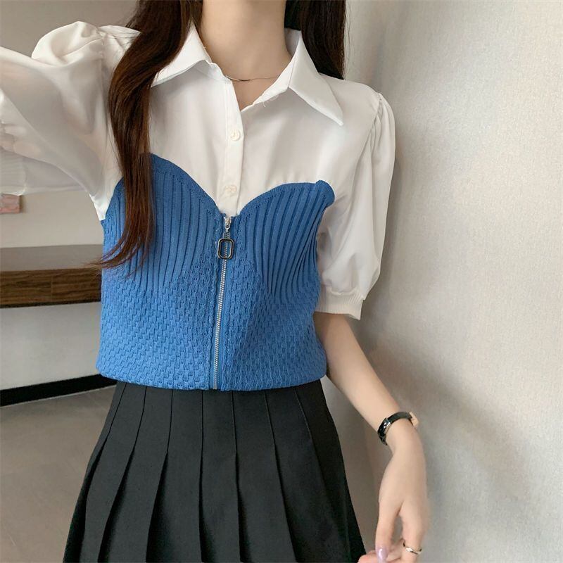 カラーステッチニット長袖シャツ春夏半袖ターンダウンカラーブラウス風シックなブラウストップス ショート ロング ハーフスリーブ スプリング 春物 サマー 夏物