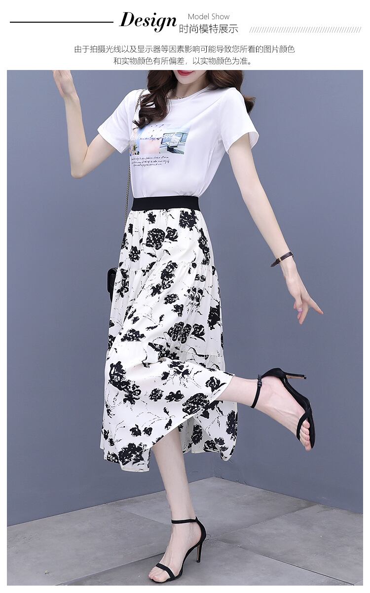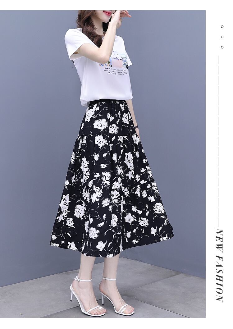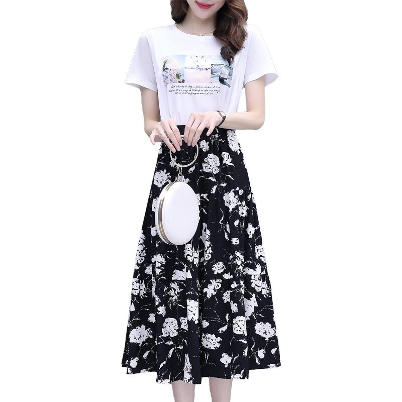 女性2ピースサマーセット:ホワイトプリントシンプルTシャツ+ブラックフラワープリントミディスカートツーピースセットレディース衣装 夏物 フラワーデザイン