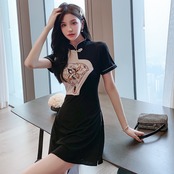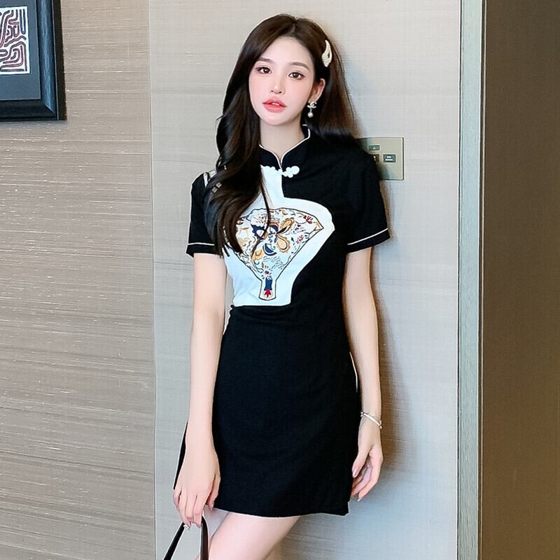 中国風ツーピースセット 女性:レトロ刺繍改良チャイナドレスミニドレス+黒ショートパンツ2点セット レッド ブラック