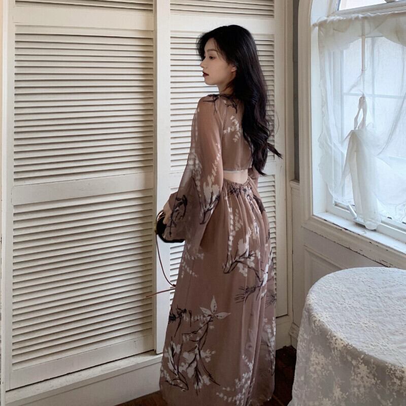 フレンチスタイルの気質花柄プリントロングドレス女性長袖 V ネックルーズボヘミアローブドレスレースアップドレス Vネック