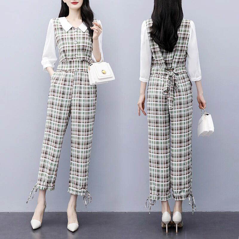 夏の女性のツーピースセット衣装: レトロな格子縞のプリント人形の襟のチュニックシャツ + 格子縞の 9 点ズボン 2 点パンツセット サマー 夏物